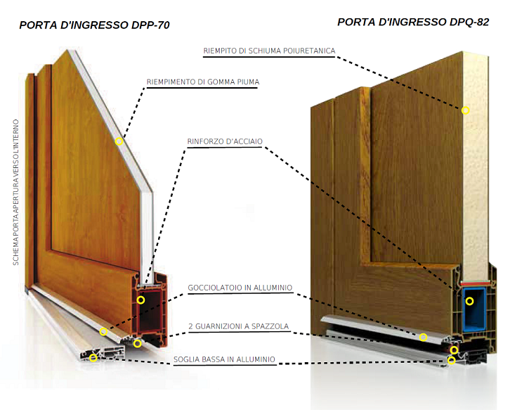 TYS Infissi fornisce porte in PVC con profili di ultima generazione. Le porte sono caratterizzate da un altissimo isolamento termico e acustico e una stabilità ottimale grazie ai rinforzi in acciaio di grande spessore. La struttura della soglia assicura un perfetto isolamento anche nella parte inferiore della porta, mentre con la doppia guarnizione vengono eliminate le correnti d'aria e le perdite di calore. L'uso del gocciolatoio in alluminio permette lo scarico dell'acqua sotto la pioggia.